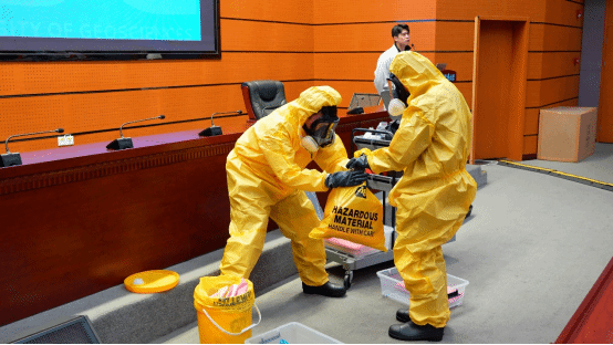 曹志伟逐步讲解并指导模拟人员实操演练,以实验室的500毫升浓硫酸洒溢为例,详细介绍了危险化学品洒溢的应急处理流程和方法。演练过程中,8名同学扮演学院、实验室的学生、实验教师、应急人员等不同角色,模拟了事故发生、疏散、上报、专业处置、恢复实验室运行的全过程,并生动展示了大家容易疏忽的安全细节。在场师生认真观看并纷纷拍摄、记录、学习。本次活动既检验了应急预案的可操作性,也增强了师生的实战能力。